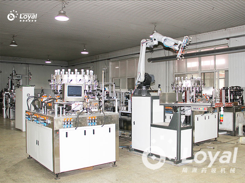 西林瓶生產線包括:自動上管、自動成型、經機械手轉換至前端檢測線(也叫生產管控)、檢測線檢測的項目:1、瓶口內外徑 2、瓶身長短 3、瓶身外徑 4、瓶口邊厚 5、瓶底內凹尺寸檢測;經檢測后的合格品再用機械手夾盤轉換至退火爐網帶上,經高溫減除應力后再降溫,通過氣動吸盤將回火后的小瓶轉換至后端檢測線,后端檢測(也是重檢也叫終檢),經后端拍照檢測項目